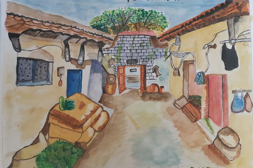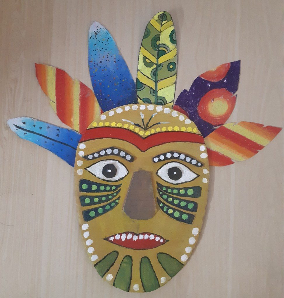 The following is an African mask made out of simple materials found at home such as A4 size thick cardboard, poster paints and brushes, fevicol, round tip safety scissors, pencil, sharpener, tissue papers. This was an artwork that I did recently.